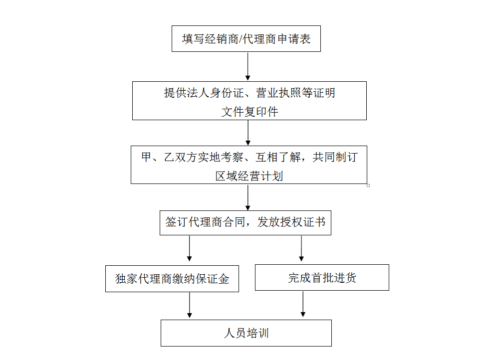 5、保證金:區域******經銷商須向公司交納保證金,在結束經營后可返還,也可以折抵貨款,具體費用請直接與大區經理聯系。
